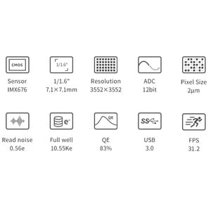 Diese Kamera ist mit einem modernen 1,6"-Sensor mit 3552*3552 Pixeln ausgestattet. Der IMX676 bietet neben der modernen Starvis-2-Technologie (mit Back-Illumination) ein extrem glattes Bild ohne Verstärkerglühen (Amp-Glow) - er überzeugt aber vor allem durch die sehr hohe Auflösung von 2,0-µm-Pixel, sowie die relativ hohe Bildrate. Die Kamera eignet sich dadurch vor allem für folgende Anwendungen: