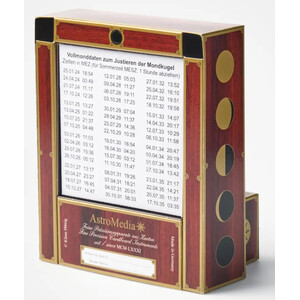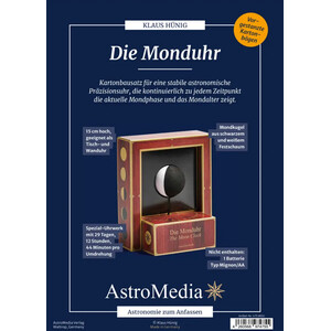 Die Monduhr von AstroMedia hat zwar historische Vorbilder in den großen astronomischen Uhren des Mittelalters, aber als Wand- und Tischuhr ist sie vermutlich weltweit die erste und einzige, die den Wandel der Mondphase auf diese Weise zeigt. Der Zusammenbau dieses Kartonbausatzes mit Spezialuhrwerk ist unkompliziert und führt zügig zu einem sehr edlen Ergebnis.