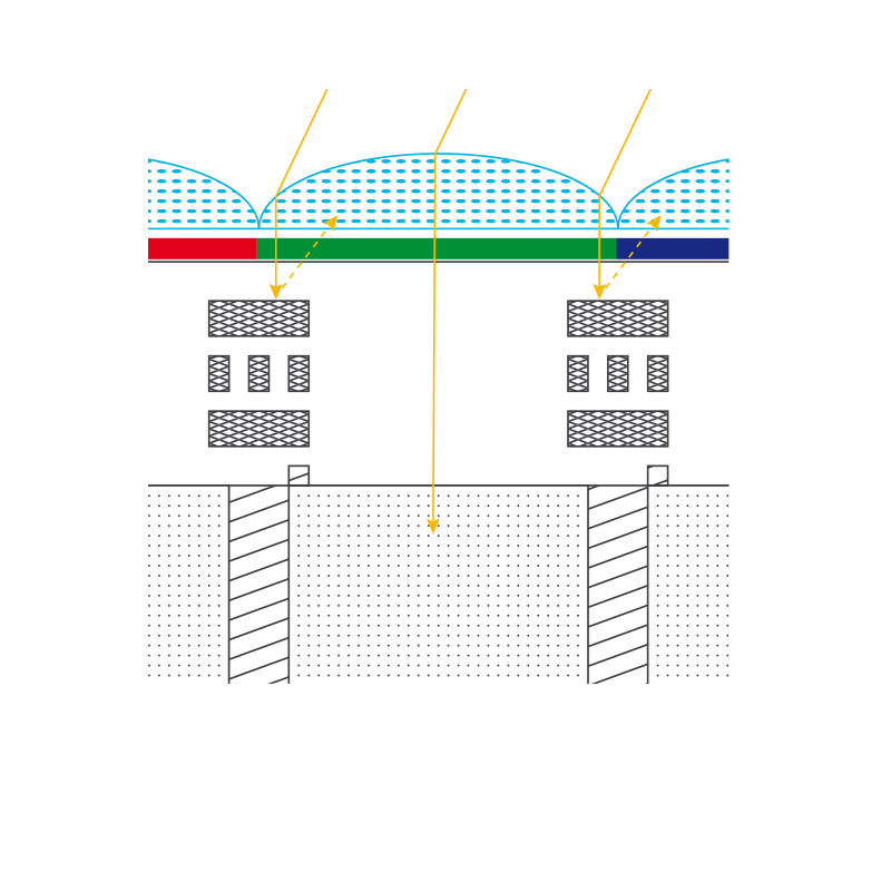 Sony hat die Sensoren auseinander genommen und ganz anders aufgebaut. Nun passieren die Photonen die Mikrolinsen und dann die Farbfilter. So weit so klar. Doch im Anschluss kommen sofort die Pixel.