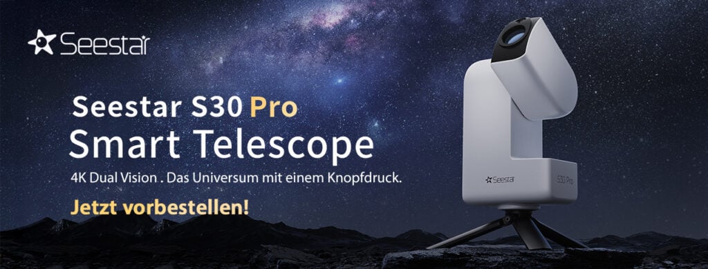 Das neue Seestar S30 Pro ist der Nachfolger des sehr beliebten Seestar S30 Smart-Teleskops. Das Seestar ist ein vollautomatisches GoTo-Teleskop für die Natur- und Astrofotografie mit zwei eingebauten Kameras. Es wird über das Smartphone oder Tablet mit Hilfe der bewährten Seestar-App gesteuert.
