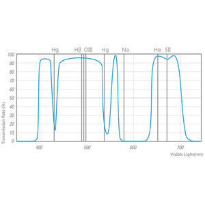 Der STC Astro Multispectra-Filter ist ein universeller Filter zur Unterdrückung von Lichtverschmutzung, der für die Verwendung mit DSLR-Kameras entwickelt wurde. Er reduziert effektiv Störungen durch künstliche Lichtquellen wie Quecksilber- und Natriumdampflampen, lässt jedoch die wichtigen Emissionslinien von Nebeln passieren und verbessert so den Kontrast astronomischer Objekte. Er wurde verbessert, um mehr als 95 % des Lichts aus den Hauptspektrallinien von Emissionsnebeln durchzulassen, wie z. B. die vorherrschende Wasserstoff-Alpha-Linie bei 656,3 nm, die Sauerstoff-III-Linie bei 495,9 und 500,7 nm und die Wasserstoff-Beta-Linie bei 486,1 nm. Sie ist mit der IBAD-Technologie (Ion Beam Assisted Deposition) auf Schott® B270-Optikglas beschichtet, was für eine höhere Haltbarkeit und einfache Reinigung sorgt. Da Lichtverschmutzung und Luftleuchten mit dem ASTRO-Filter herausgefiltert werden, können bei diesen längeren Belichtungszeiten viel mehr interessante Wellenlängen des Deep-Sky-Objekts aufgezeichnet werden.