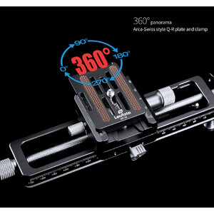 Der Schlitten ist mit einer Aufnahme für Schnellwechselplatten nach Arca-Swiss-Standard ausgestattet. Im Lieferumfang ist bereits eine Platte enthalten. Die Platte kann um 90° gedreht werden, so dass der Schlitten für seitliche Bewegungen der Kamera oder für die Veränderung der Entfernung zum Objekt verwendet werden kann.
