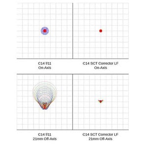 Die Schärfe ist über eine Diagonale von 42 Millimeter exzellent, mit Spotgrößen, die bis zu 9x kleiner sind als die des nativen Teleskops! Das Öffnungsverhältnis ist beim C14 auf 1:7,3 und beim C11 auf 1:7 erhöht, was eine Geschwindigkeitssteigerung von 2,3x bzw. 2x bedeutet.