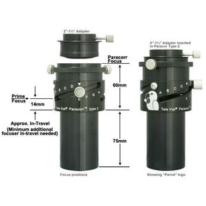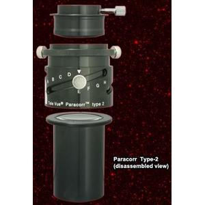 Der Paracorr kann sowohl mit 2" als auch mit 1,25" Okularen verwendet werden. Zur visuellen Benutzung müssen sie den Paracorr nur wie eine Barlow in Ihren Okularauszug, und das Okular in den Paracorr stecken. 1,25" Okulare machen von seinem besonders kurzem 1,25" Reduzieradapter gebrauch. Ein 2" Filtergewinde ist vorhanden. Außerdem kann die Komakorrektur zusätzlich mithilfe des einstellbaren Aufsatzes "Tunable Top" am Paracorr optimiert weden. Wie sie bereits gelesen haben, jedes Newtonteleskop kann von der Korrektur der Koma im Bildfeld mit einem TeleVue Paracorr profitieren. Der wichtigste Aspekt zur Optimierung der Komakorrektur ist der korrekte Arbeitsabstand (+/- einer kleinen Toleranz natürlich) zwischen der letzten optischen Oberfläche des Paracorrs und dem Fokuspunkt des Okulars (Position der Feldblende). Typische an einem schnellen Newtoneleskop eingesetzte Okulare haben um bis zu 15mm im Abstand verschiedene Feldblenden. Um diese Unterschiede zu kompensieren haben wir den Tunable Top entwickelt. Er erlaubt eine optimierte Korrektur der Bildfehler für alle Okulare von TeleVue sowie diversen anderen Herstellern, lösen Sei einfach die Schraube und drehen Sie dam Tunable Top so lange bis die Okularhülse den richtigen Arbeitsabstand zum Paracorr erreicht hat. Zu Ihrer Hilfe gibt es einen Guide für die optimale Einstellung der Korrektur verschiedener TeleVue Okulare.
