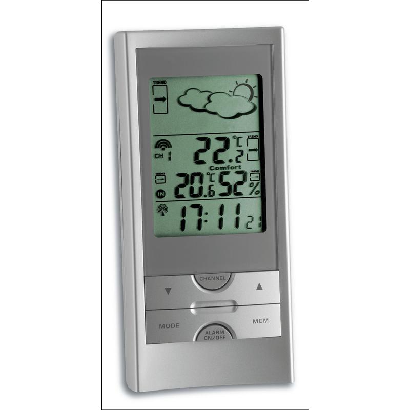 kabellose Übertragung der Außentemperatur über bis zu 3 Sender (max. 60 m),Anzeige der Innentemperatur und Luftfeuchtigkeit mit Komfortzone,Max.-Min.-Funktion,Tendenzanzeigen,Wettervorhersage,Luftdrucktendenz,Funkuhr mit Datumsanzeige,Alarm und Snooze-Funktion,Messbereich Temperatur außen: -20..+60°C, innen: -5 .. + 50 °C, umschaltbar °C/°F,Luftfeuchtigkeit 20..95 %,Zeitzone ±12 Std.,zum Hängen oder Stellen,