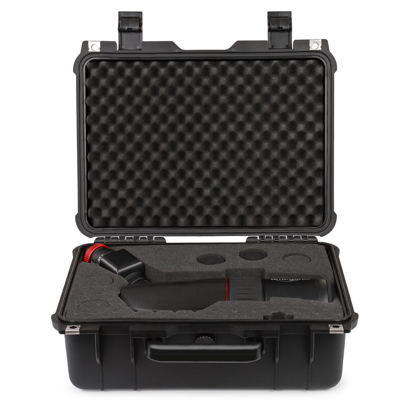 Unterwegs auf Reisen oder bis zum nächsten Beobachtungsplatz: Ihr Binospektiv und die Okulare finden in einem stabilen Koffer mit angepassten Aussparungen aus Schaumstoff Platz. Er bietet Platz für ein weiteres Paar Okulare, zum Beispiel für eine höhere Vergrößerung. So schützen Sie Ihre Ausrüstung und können sie ganz einfach mitnehmen.
