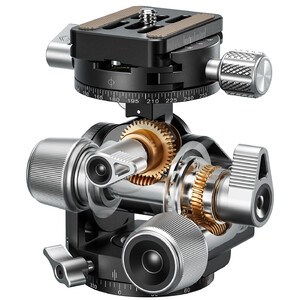 Der Getriebekopf erlaubt die unabhängige und präzise Einstellung für die Bewegungen Nicken und Rollen. So kann der Bildausschnitt sehr genau gewählt werden, sowie das häufig von der Architektur- und Produktmakrofotografen benötigt wird.
