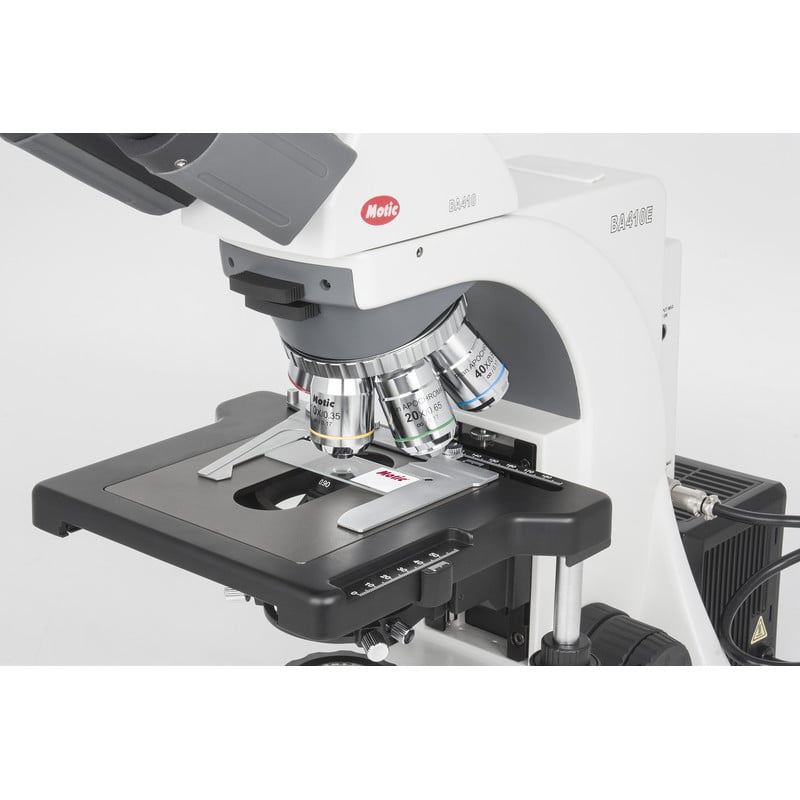 Das etablierte Flaggschiff von Motic, ist das BA410 Elite. Es bietet die höchste optische Leistung. Ein kompletter Satz von plan Apochromaten ist jetzt für höchste Ansprüche in der Farbwiedergabe und Auflösung vorhanden. Das BA410E bietet die eine hervorragende Farbtreue und ermöglicht auf diese Weise profunde Diagnosen in Pathologie, Hämatologie und Zytologie. Ein verbessertes Auflösungsvermögen für detailliertere Auswertung ihrer Probe wird durch die hohen numerischen Aperturen erreicht. Die AUTO-ON-OFF-Funktion mit seinem energiesparenden Aspekt verbessert die Laborsicherheit: eine abschließende Gerätekontrolle am Ende des Arbeitstages ist nicht mehr notwendig. Die eingestellte Lichtintensität jedes Objektivs wird am Revolver gemessen, gespeichert und bei jedem Wechsel zwischen den Objektiven wieder hergestellt. Auf diese Weise ist es nicht nötig bei jedem Umschaltvorgang auf eine andere Vergrößerung die Beleuchtung einzustellen. Bei Bedarf von sehr starker Beleuchtung steht eine 100W Halogen-Version zur Verfügung. Der zahnstangenfreie Kreuztisch, wie er auch von BA210 / BA310 Elite-Modelle bekannt ist, wird nun in diesem Vorzeigemodell übernommen. Der keramische Kreuztisch sorgt für höchste Abriebfestigkeit, garantiert eine perfekt flache Anordnung des Glasobjektträger für ein Leben lang.