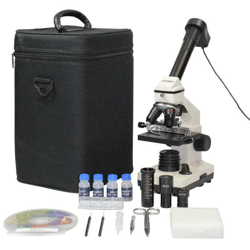 Es ist bereits alles dabei, was Sie für den Start benötigen: digitales PC Okular für die Übertragung auf den Computer, Bearbeitungssoftware für Ihre Bilder, eine Barlowlinse für höhere Vergrößerungen, umfangreiches Mikroskopierbesteck, Dünnschnitt-Werkzeug, Dauerpräparate, Brutstätte, Garneleneier, Seesalz, Hefe, 10 Objektträger und Deckgläser, Tragekoffer und Netzteil