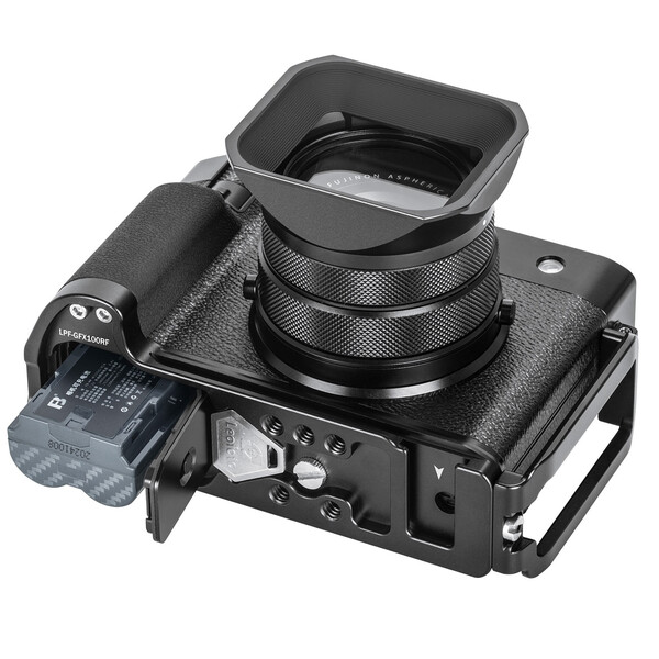 L-Platte passend für die Fujifilm GFX100RF. Der kameraspezifische L-Winkel garantiert eine verdrehsicheren Halt im Quer- und Hochformat.