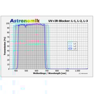 Astronomik präsentiert drei unterschiedliche UV+IR Blockfilter für den Luminanzkanal, sie werden mit L-1, L-2 und L-3 bezeichnen. Achten Sie bitte auf die entsprechende Bezeichnung im Produktnamen.