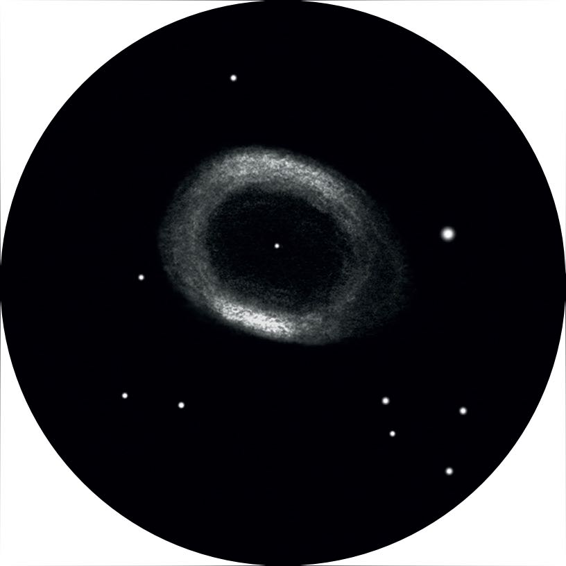 Zeichnung des Ringnebels mit einem 18 Zoll Dobson bei einer Vergrößerung von 300–450×. Rainer MannoffViele planetarische Nebel sind nicht kreisrund, sondern oval, schmetterlingsförmig oder rechteckig. Bei Messier 57 handelt es sich um einen leicht elliptischen Gasring, der etwa 2300 Lichtjahre von uns entfernt ist. Ein nicht sehr massereicher Stern hat im Laufe seines Lebens Wasserstoff aufgebraucht und seine äußere Hülle verloren. Sein Durchmesser beträgt 0,9 Lichtjahre, wobei die lichtschwachen Bereiche sich auf bis zu 2,4 Lichtjahre ausdehnen. Er hat einen scheinbaren Durchmesser von etwa 118 Bogensekunden und ist vor rund 15.000 Jahren entstanden. Die tatsächliche Form der Gashülle ähnelt einem Torus und sieht eher wie ein Rettungsring oder Reifen aus. Der Ring dehnt sich mit etwa 19 km/s immer noch langsam aus.