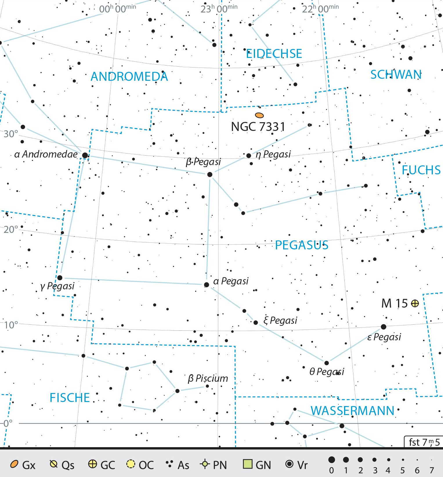 Das Glanzlicht des Sternbilds ist zweifellos M 15. Bereits mit einem kleinen Fernglas ist der Kugelsternhaufen als winziger Fleck erkennbar – es ist das gesammelte Licht von 12,5 bis 13 Milliarden Jahre alten Sternen. Die hellsten Sonnen sind 12,6m hell und zeigen sich deshalb schon mit 100mm Öffnung. Für die Galaxie NGC 7331 reicht ebenfalls schon ein Einsteigerteleskop. Und Besitzer von größeren Teleskopen dürfen sich unter dunklem Himmel gerne an der Herausforderung der sehr schwachen Galaxiengruppe Stephans Quintett versuchen.