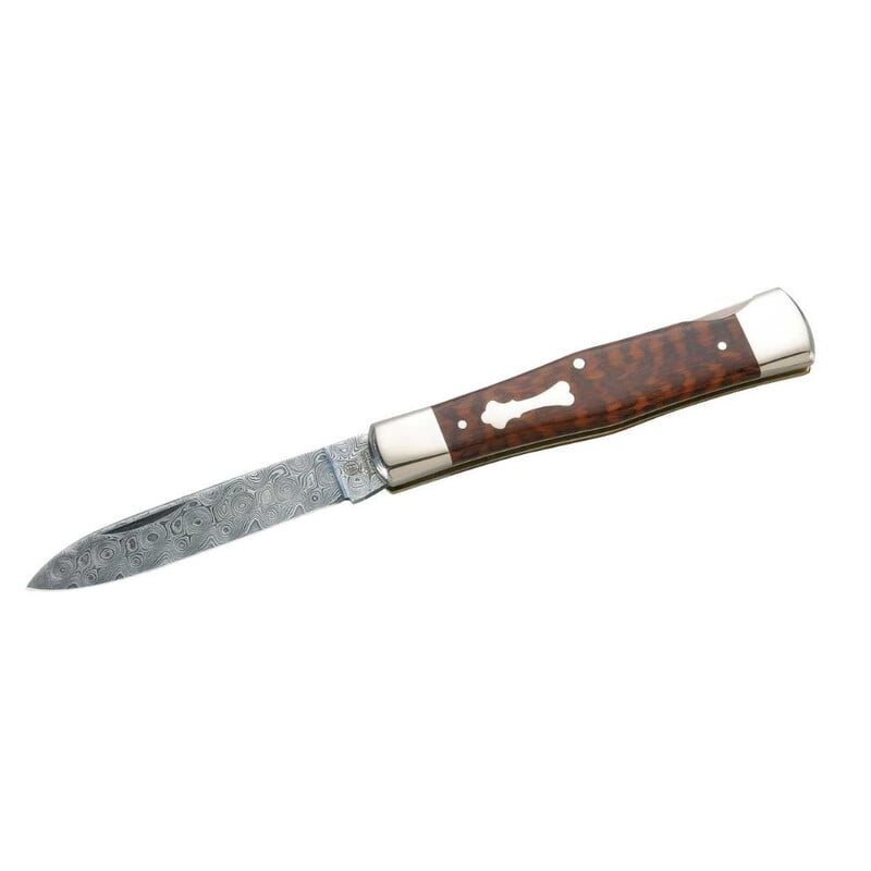 Wer echten Damaststahl bei einem Super verarbeitetem Taschenmesser mit 300 Lagen Rosendamast sucht,
