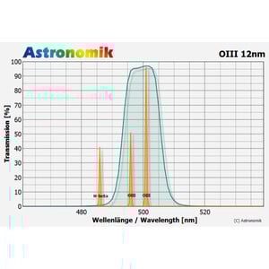 Der Astronomik OIII Filter filtert die Emissionslinien von Hoch- und Niederdruckdampflampen (Natrium (Na) und Quecksilber (Hg)) sowie alle Linien des natürlichen Airglow und den größten Teil des störenden Mondlichts vollständig heraus.
