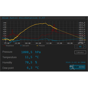 Anwendung in der Astronomie: Moderne High-End-Montierungen benötigen Zugang zu aktuellen Wetterdaten, um den Einfluss der atmosphärischen Refraktion korrekt auszugleichen. Die Daten müssen vor Ort ermittelt werden und beeinflussen sowohl die Positionierung als auch die Nachführung. Für fest in einer Sternwarte installierte Teleskope bieten wir Wetterstationen, die jedoch allesamt nicht für den mobilen Einsatz ausgelegt sind. Die Blue Astro-USB-Wetterstation kann flexibel mobil oder stationär genutzt werden.