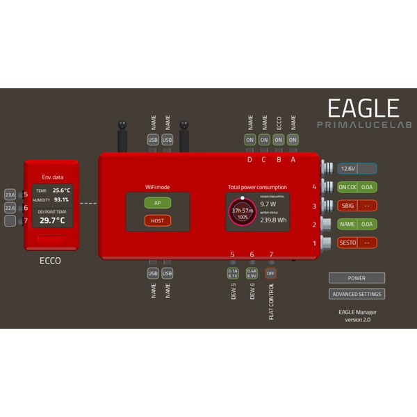 Plug&Play-Funktionalität. Schließen Sie einfach die Temperatursensoren (die in der Nähe der Optik Ihres Teleskops befestigt werden müssen) an das Gerät und das USB-Kabel an einen der USB-Anschlüsse des EAGLE an (ECCO ist kompatibel mit EAGLE der zweiten Generation, die mit Anschlüssen für die Stromversorgung der Tauheizungen ausgestattet ist), und schon wird es im EAGLE Manager angezeigt (es ist mindestens EAGLE Manager Version 2.0 erforderlich). Sie können in Echtzeit die Taupunktberechnung, die von den installierten Temperatursensoren gemessene Temperatur und die vom EAGLE an die Tauchheizungen gelieferte Leistung sehen. ECCO benötigt keine externe Stromversorgung!