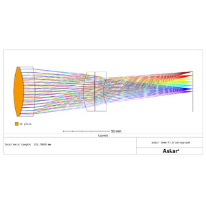 Der ASKAR 50P ist ein 4-Element-Apochromat nach Petzval . Im Objektiv ist ein SD-Glas verbaut für eine gute Korrektur des Farbfehlers. Der Apo ist korrigiert für Kameras bis Vollformat.