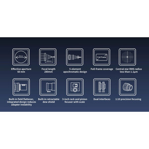 - Eingebaute Flatfield-Optik: Erzielt bis Vollformat Bildkorrektur ohne Vignettierung, ohne Verzerrung und für runde, gestochen scharfe Sterne.