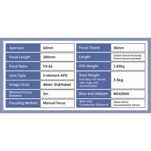 - Schnelles Öffnungsverhältnis von f/4,66: Hohe Lichtsammelleistung für die Aufnahme von Weitfeld-Deep-Sky-Objekten, die selbst bei kurzen Belichtungszeiten Details erkennen lassen.
