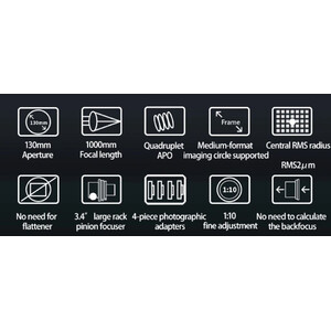 Der größte Refraktor aus dem Hause ZWO besteht aus einem Triplet-Objektiv mit zwei ED-Gläsern und einem Einzelelement. Mit diesem Petzval-ähnlichen Linsendesign wird eine hervorragende Farbkorrektur und Schärfe erreicht. Mit seinem selbstebnenden Design hat der FF130 große Vorteile bei astronomischen Aufnahmen. Er bietet mehr als das Vollformat-Bildfeld und verfügt über ein feines Spotdiagramm mit nur winzigen Verzerrungen der peripheren Sterne.