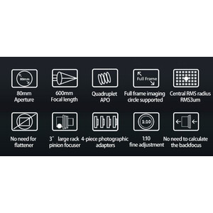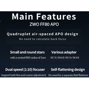 Der ZWO FF80 Quadruplet ist ein sehr kompakter apochromatischer Refraktor für die Astrofotografie mit einem korrigiertem Bildfeld bis Vollformat und die Beobachtung bis in den höchsten Vergrößerungsbereich. Das Teleskop hat ein Öffnungsverhältnis von f/7,5 bei einer Brennweite von 600mm. Der FF80 ist ein Quadruplet-Design mit zwei ED-Gläsern, was eine hervorragende Unterdrückung von chromatischer Aberration ermöglicht.