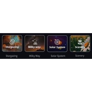 • Vier Einstellungen: Astronomie (Deep-Sky), Sonnensystem, Milchstraße, Landschaft
